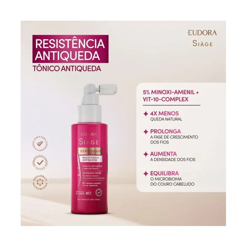 Quais os Benefícios do Tônico Eudora Siàge Dermo Scalp Hair Rebalance? – Reduz em 4x a queda natural dos fios; – Prolonga a fase de crescimento capilar; – Fortalece os fios desde a raiz; – Aumenta a densidade dos fios e sua resistência à quebra; – Equilibra o microbioma do couro cabeludo; – Fórmula Clean Beauty e Vegan; – Produto Cruelty Free.